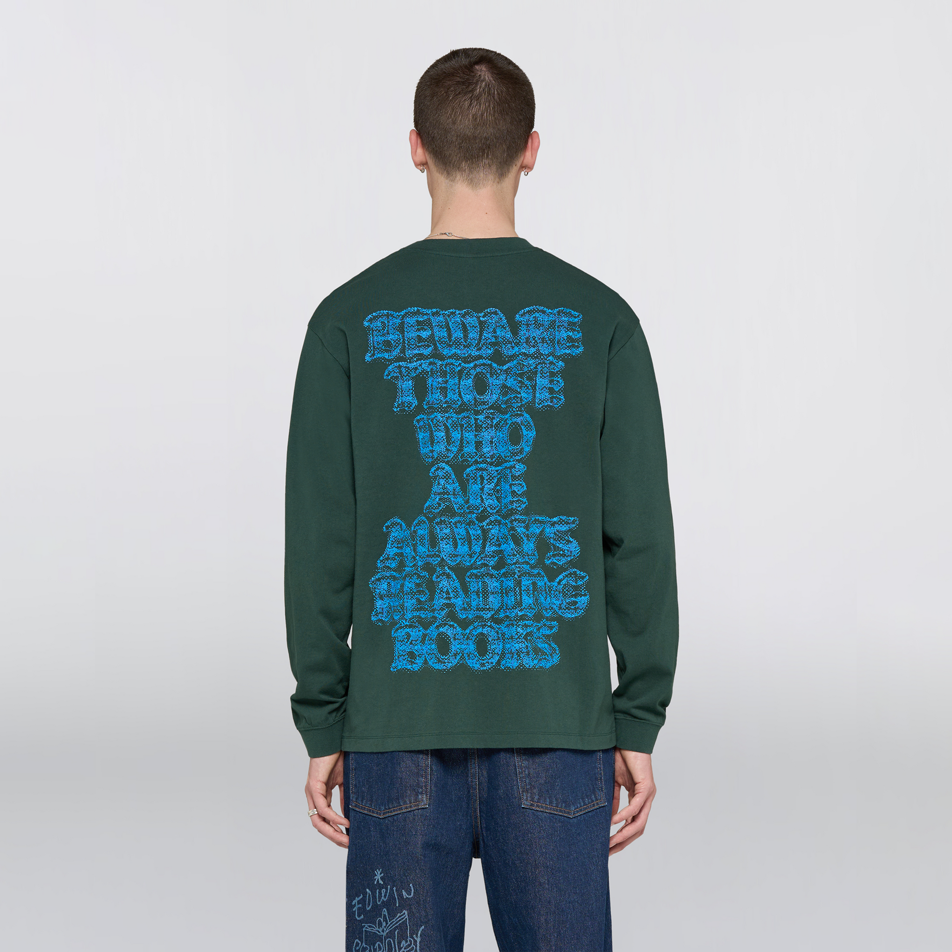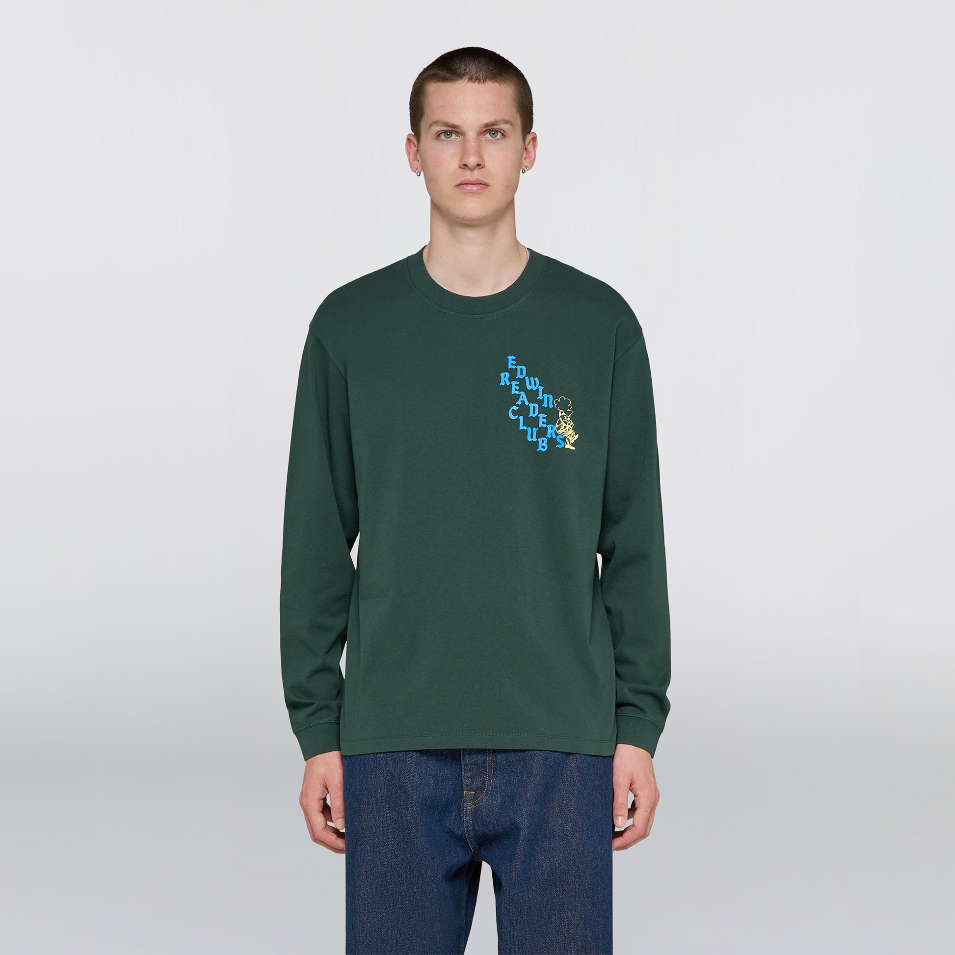 The EDWIN Always Reading LS T-Shirt is made from 160g/m² single jersey, 100% cotton. It features an oversized fit, ERC graphic prints on both chest and back, and a ribbed collar for added durability and structure.