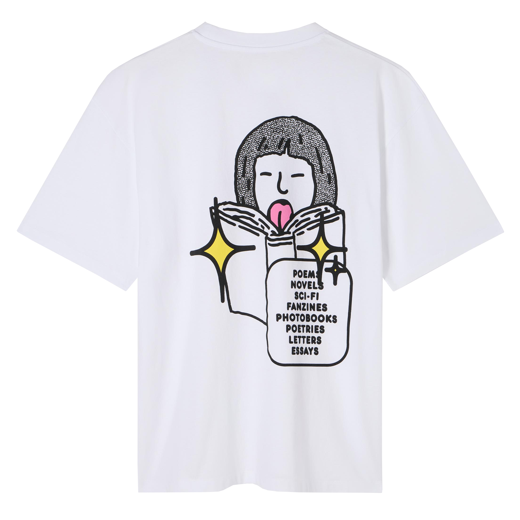 The EDWIN Love In The Books T-Shirt is a Oversized-Fit T-shirt with front and back prints and short sleeves made from 100% Cotton.
