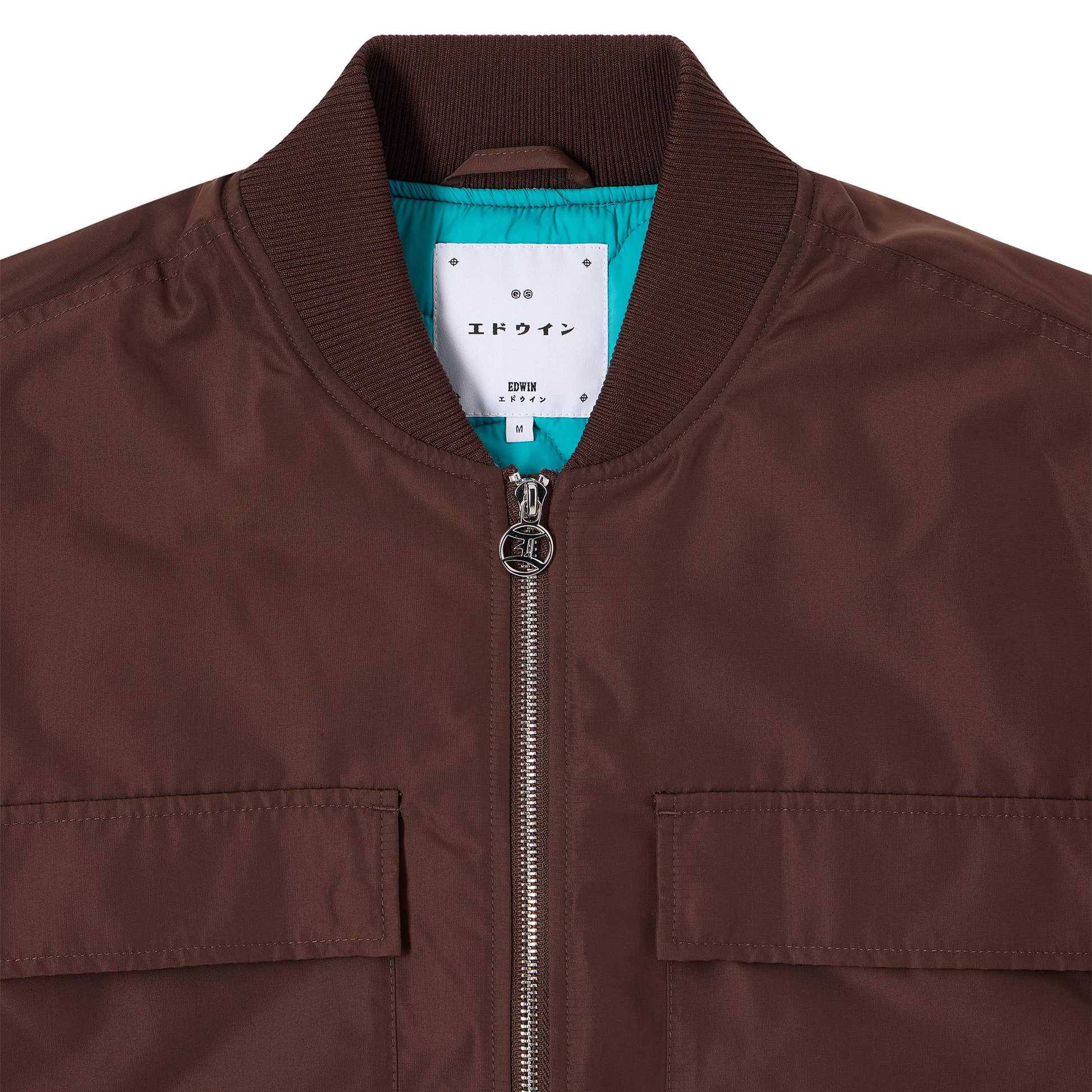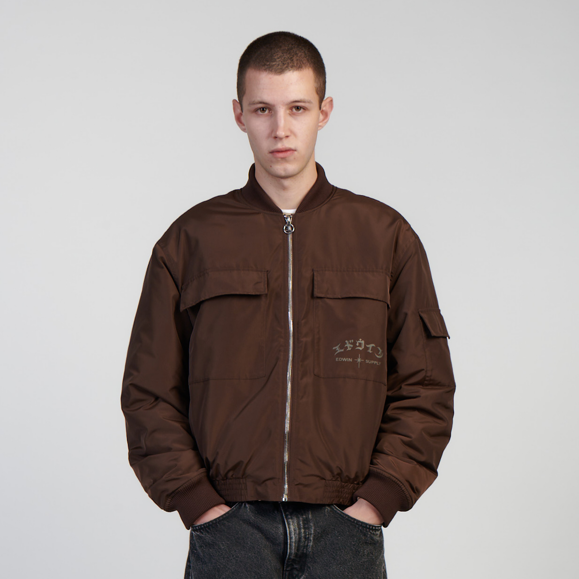 The EDWIN Ultra Bomber is a boxy fit jacket made from 125g/m² WR plain weave coated fabric (100% polyester). It features padded lining with personalized quilting, a metal zip front closure, multiple snap and zip pockets, ribbed collar and bottom, and an EDWIN print on the front pocket.