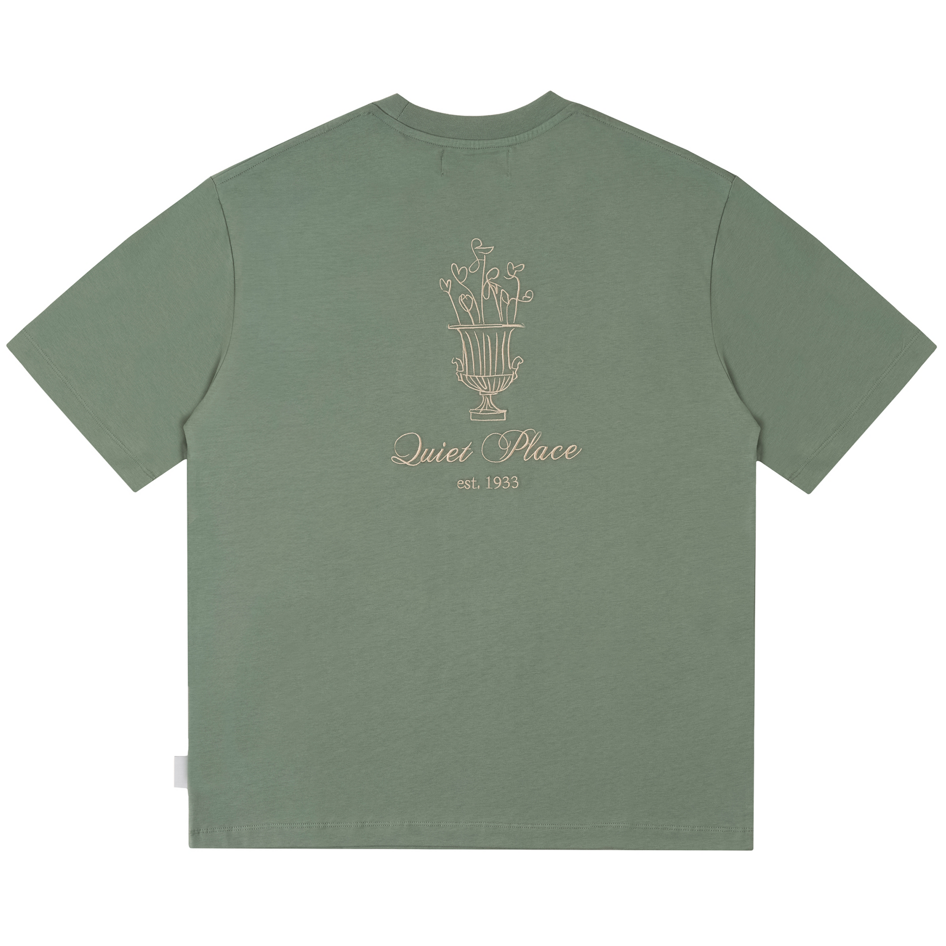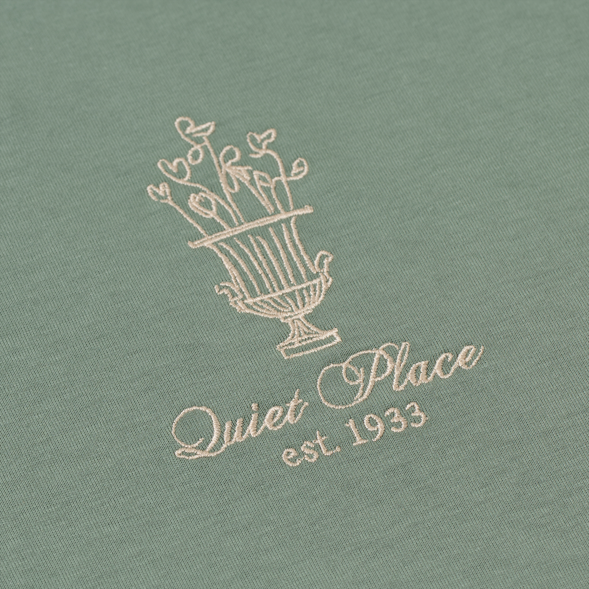Sanjo presents an oversized t-shirt defined by simplicity and detail. The Quiet Place design is embroidered on the back and mirrored on the chest, giving the piece a refined finish with a timeless, minimal character.