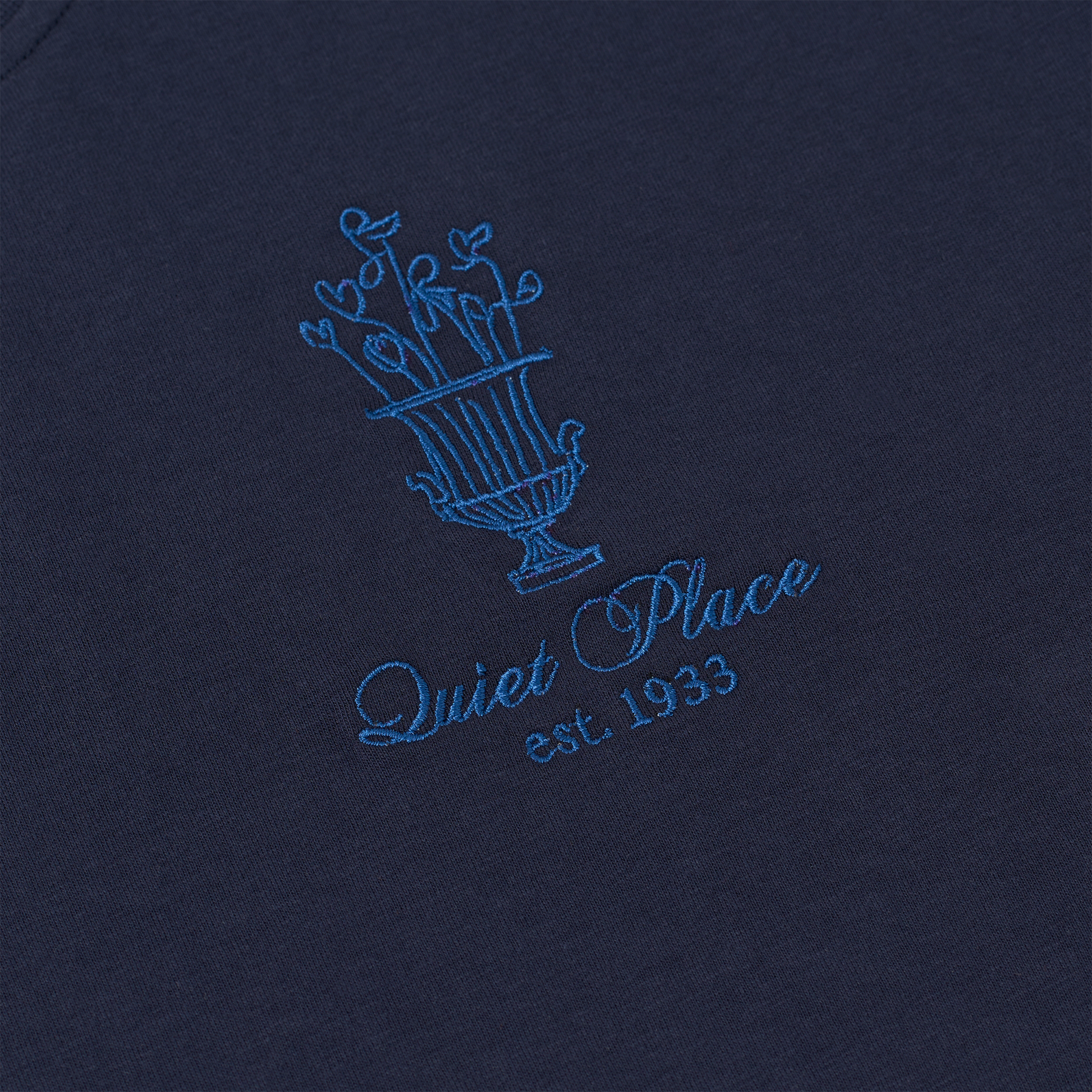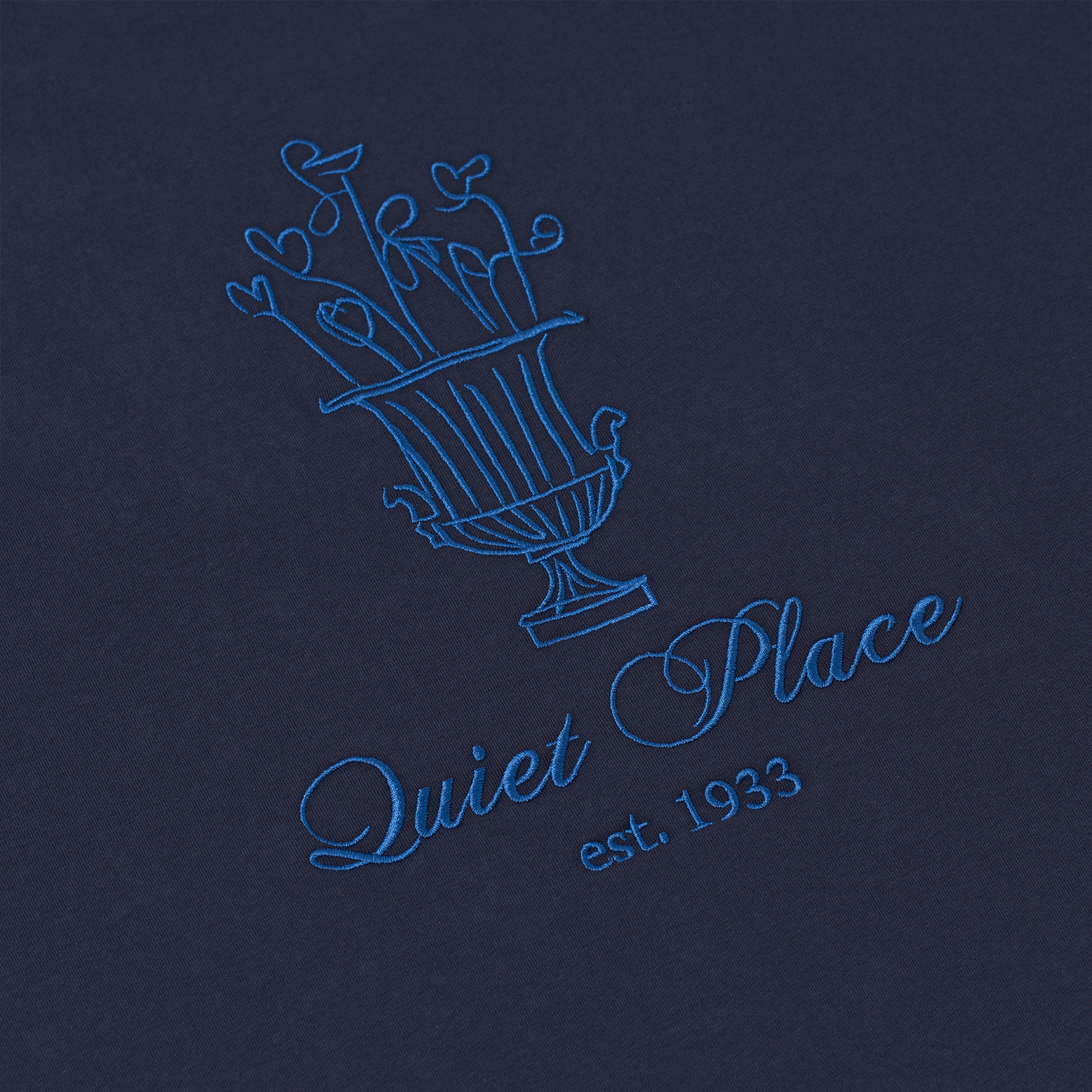 Sanjo presents an oversized t-shirt defined by simplicity and detail. The Quiet Place design is embroidered on the back and mirrored on the chest, giving the piece a refined finish with a timeless, minimal character.